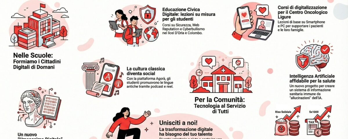 Il nostro programma di “Educazione Civica Digitale” si è arricchito di una nuova pillola creata dalla nostra nuova Socia e Volontaria Carlotta Comite che ha progettato una presentazione molto coinvolgente sul tema “Web Reputation e CyberBullismo”. Carlotta l’ha presentata in una classe del Liceo Colombo a Marzo, registrando un notevole interesse da parte della classe, che ha partecipato attivamente e ci ha dimostrato quanto purtroppo sia diffuso tale fenomeno. A oggi abbiamo concluso il nostro corso in una classe del Liceo Classico Colombo e abbiamo in programma un’altra sessione a Febbraio 2026 nel Liceo Classico A. D’Oria.